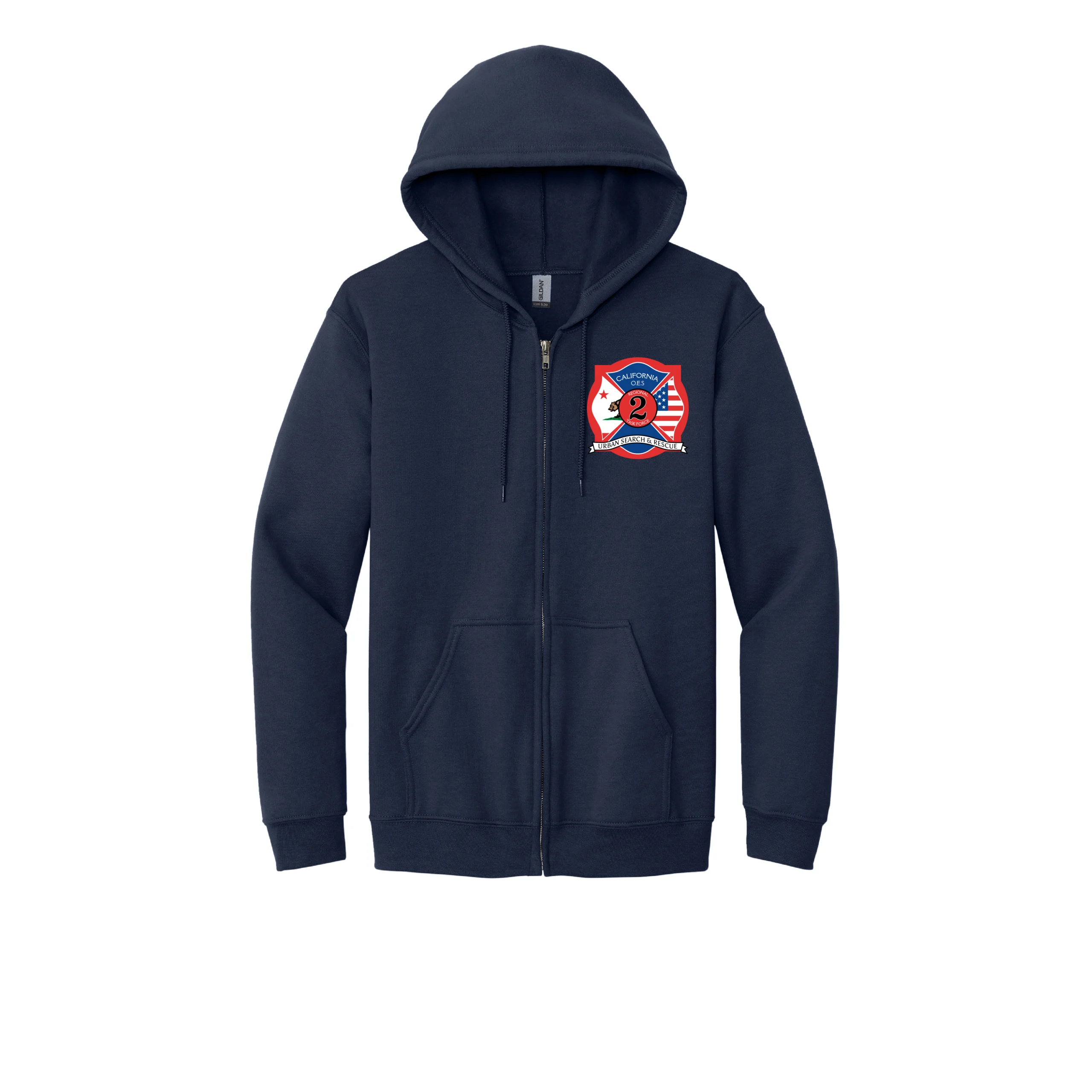 8-ounce, US 50/50 cotton/poly Double-needle stitching at waistband and cuffs Unlined hood with dyed-to-match drawcord Metal zipper 1×1 rib knit cuffs and waistband with spandex Front pouch pockets